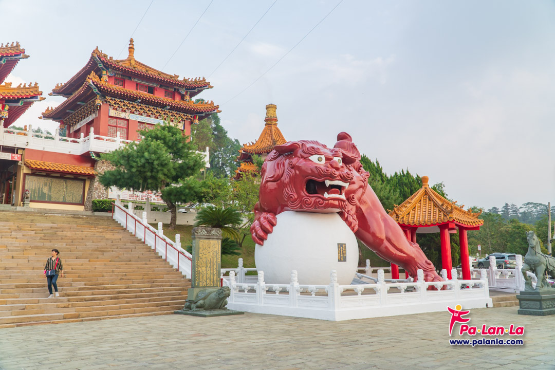 สิงโตหินอ่อนแกะสลักสีแดงบริเวณด้านหน้าของวัดทำหน้าที่เฝ้าอารักขาศาสนสถานแห่งนี้