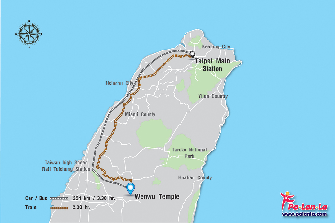 - รถยนต์ การเดินทางโดยรถยนต์จากไทเปไปยัง Wenwu Temple มีระยะทางประมาณ 254 กิโลเมตร ใช้เวลาเดินทางประมาณ 3.30 ชั่วโมง นักท่องเที่ยวส่วนหนึ่งนิยมใช้บริการทัวร์ซึ่งเดินทางโดยรถบัสจากไทเป โดยทัวร์จะพานักท่องเที่ยวแวะชมสถานที่ท่องเที่ยวน่าสนใจตามเมืองต่างๆ ระหว่างทางไป Wenwu Temple