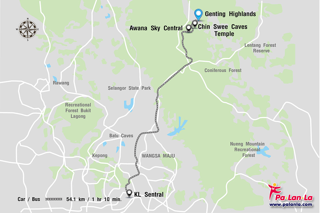 - รถประจำทาง นักท่องเที่ยวสามารถขึ้นรถประจำทาง จาก KL Sentral ใช้เวลาประมาณ 1 ชั่วโมง ไปเปลี่ยนเป็นกระเช้า (cable car) ที่ Awana Sky Central ขึ้นไปยัง Genting Highlands โดยใช้เวลาประมาณ 10 นาที หรือขึ้นรถประจำทางไปยัง Genting Highlands ได้ โดยไม่ต้องต่อกระเช้า ดูรายละเอียดและจองตั๋วล่วงหน้าได้ที่ https://www.busonlineticket.com/bus-to-genting-highlands