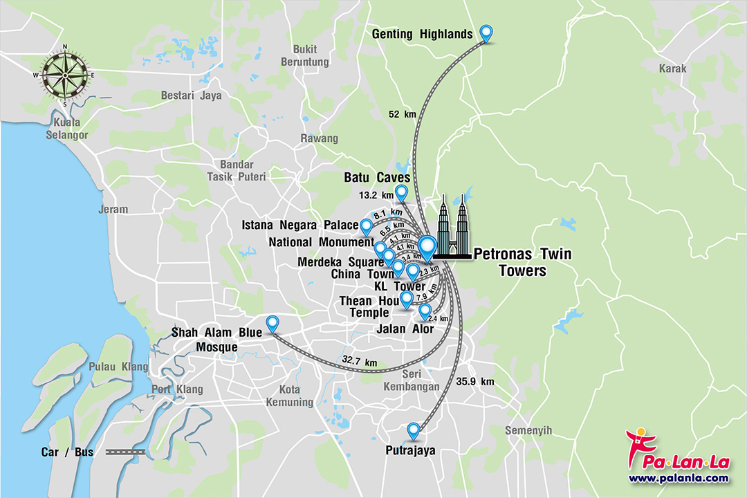 - รถยนต์ จากบริเวณสถานี KL Sentral ระยะทางประมาณ 7.8 กิโลเมตร ใช้เวลาประมาณ 19 – 25 นาที