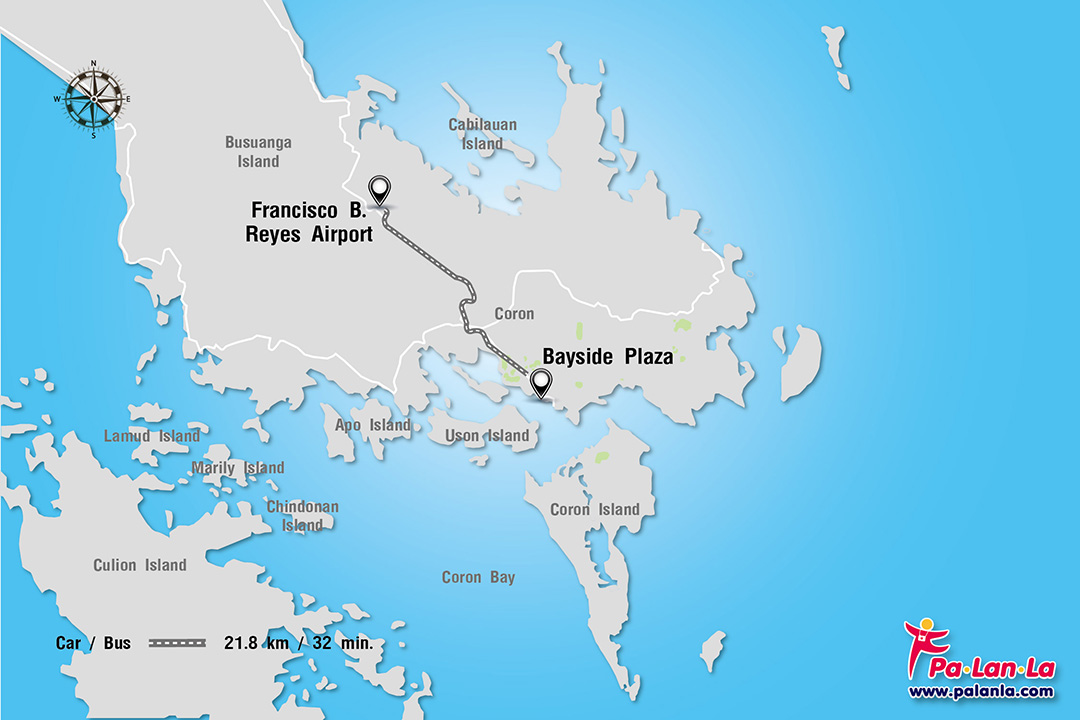 - รถยนต์ นักท่องเที่ยวต้องนั่งรถยนต์จากสนามบิน Francisco B. Reyes Airport ซึ่งตั้งอยู่บน Busuanga Island เพื่อเข้าสู่พื้นที่ของโครอน โดยจะมีรถยนต์ของที่พักในโครอนรับ-ส่งจากสนามบิน และใช้เวลาเดินทางประมาณ 32 นาทีจากสนามบินฟรานซิสโกบีเรเยสถึงเบย์ไซด์พลาซ่า