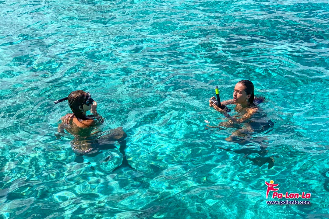 นักท่องเที่ยวกำลังดำน้ำดูปะการังเหนือน้ำทะเลที่ CYC Beach