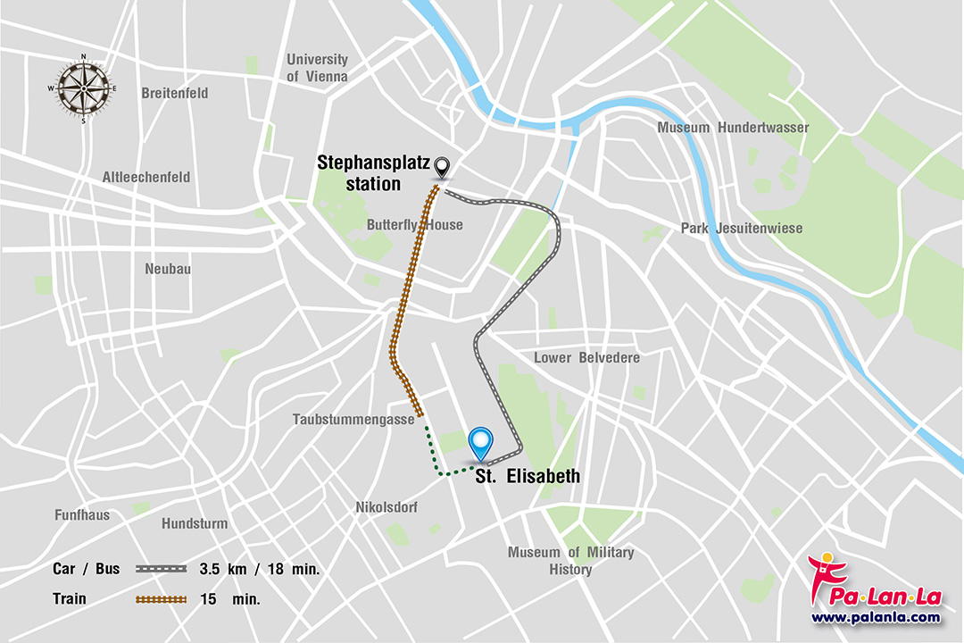 - รถยนต์ (Car) การเดินทางโดยรถยนต์จากสถานี Stephansplatz station ไปยังเซนต์เอลิซาเบธ มีระยะทาง 3.5 กิโลเมตร ใช้เวลาเดินทางประมาณ 18 นาที โดยใช้ถนนสาย Parkring ไปทาง Schwarzenbergpl จากนั้นขับไปทาง Prinz Eugen-Straße และเดินทางต่อไปบน Theresianumgasse ที่มุ่งสู่ Sankt-Elisabeth-Platz