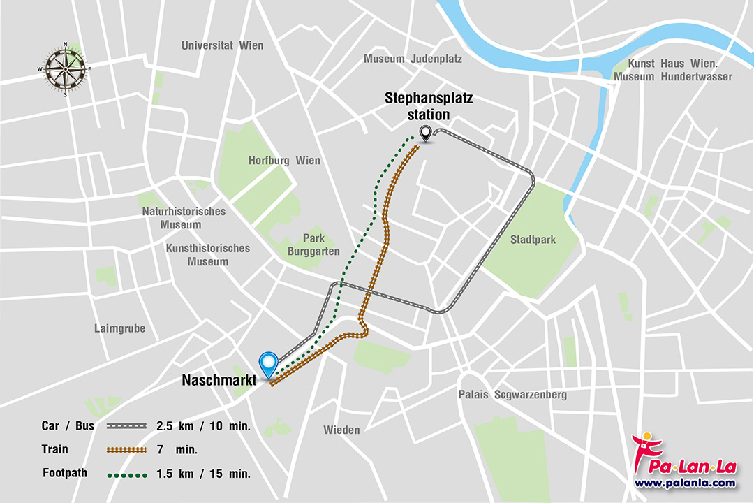 - การเดิน (Footpath) จาก St. Stephen's Cathedral นักท่องเที่ยวสามารถเดินไปตลาด Naschmarkt ได้ ผ่าน Austrian National Library ตรงไปเรื่อยๆ ใช้เวลาประมาณ 15 นาที