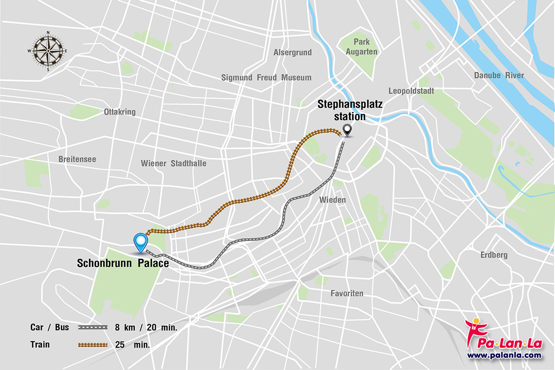- รถยนต์ (Car) การเดินทางโดยรถยนต์จาก Stephansplatz station ไปยังพระราชวังเชินบรุนน์ มีระยะทาง 8 กิโลเมตร ใช้เวลาประมาณ 20 นาที โดยสามารถใช้ถนนสาย Parkring, Schubertring, Kärntner Ring และ Operngasse ไปยัง Friedrichstraße / B1 ที่มุ่งสู่ Schönbrunner Schloßstraße