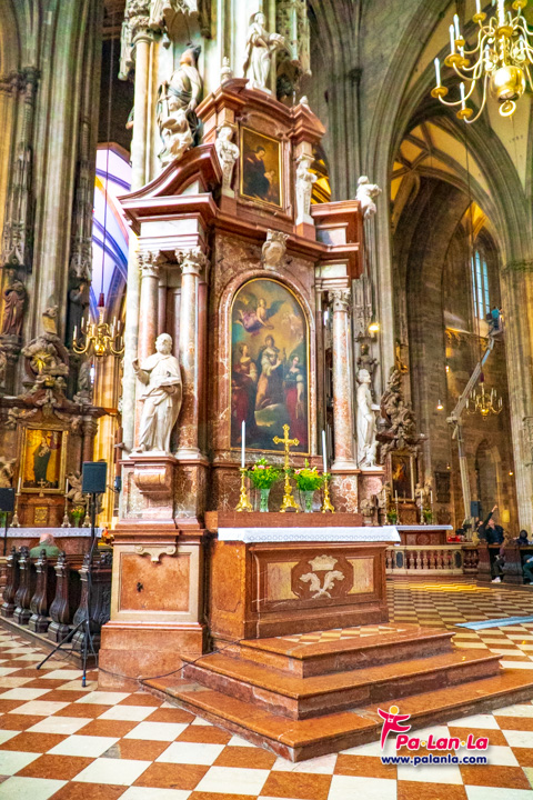 แท่นบูชาที่สูงและมีรูปปั้นทางศาสนาอันโด่งดังของเวียนเนอร์ นูสตัดท์ ซึ่งเป็นหนึ่งใน 18 แท่นบูชาของมหาวิหารเซนต์สตีเฟ่น