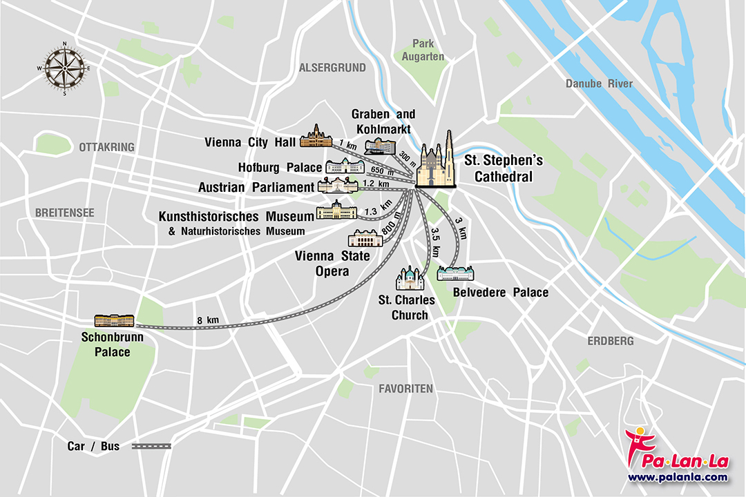 แผนที่แสดงสถานที่ท่องเที่ยวในเมืองเวียนนาโดยมี St. Stephen’s Cathedral ที่โดดเด่นเป็นศูนย์กลาง