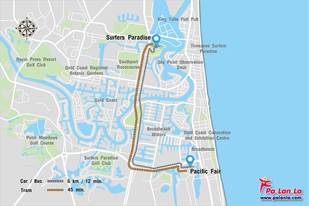 - รถประจำทาง (Bus) จาก Surfers paradise ขึ้นรถประจำทางสาย 731 หรือ 738 ไปลงที่ป้าย Pacific Fair ได้เลย ใช้เวลาประมาณ 25 นาที