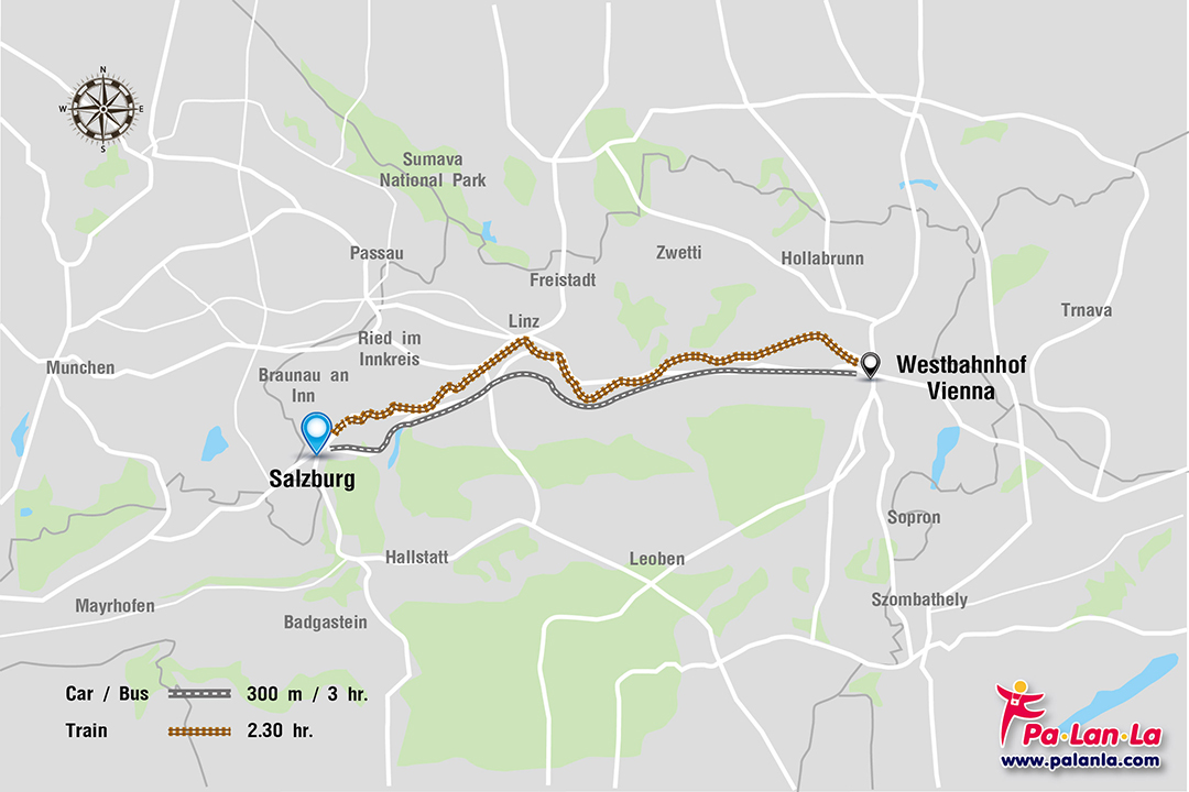 - รถไฟ (Train) การเดินทางโดยไฟจากเวียนนาไปยัง Salzburg นักท่องเที่ยวสามารถนั่งรถไฟจากสถานี Wien Westbannhof ไปยังเมือง Salzburg ได้เลย ใช้เวลาเดินทางประมาณ 2 ชั่วโมง 30 นาที