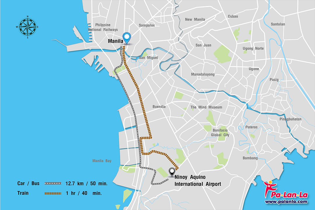 - รถไฟฟ้า หากนักท่องเที่ยวเริ่มจากสนามบินนานาชาตินินอยอาควิโน (Ninoy Aquino International Airport) ต้องเดินมายัง เทอมินอล 1 เพื่อขึ้นรถไฟฟ้า ระยะทางประมาณ 400 เมตร ลงที่สถานี Doroteo Jose ซึ่งเป็นสถานีใจกลางกรุงมะนิลา