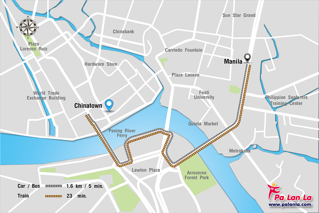 - รถไฟฟ้า (MRT/LRT) จากกรุงมะนิลาให้เดินไปประมาณ 900 เมตร ขึ้นที่สถานี Doroteo Jose นั่งไปลงยังสถานี Carriedo LRT Station และเดินต่ออีกเล็กน้อย