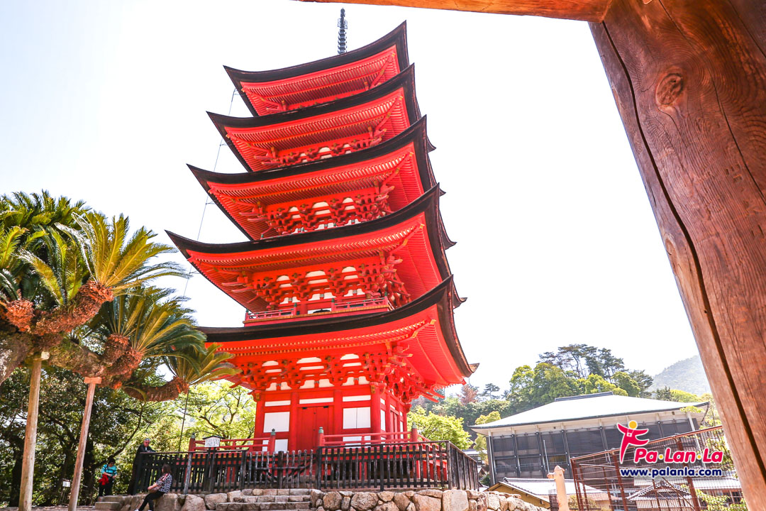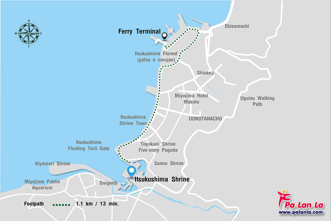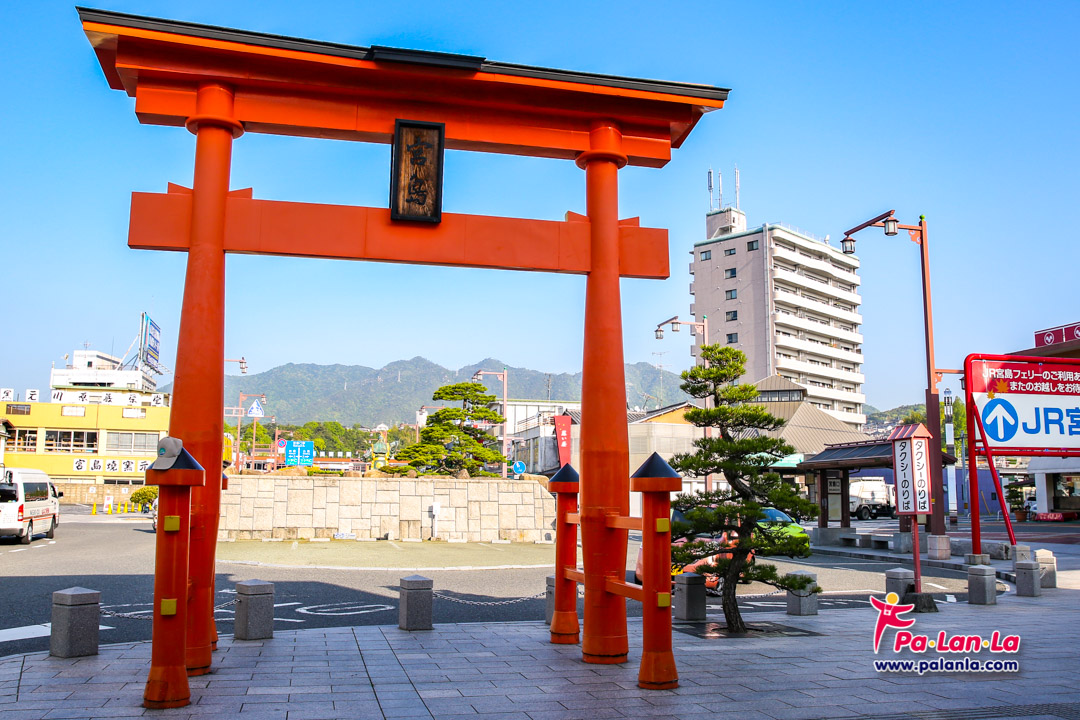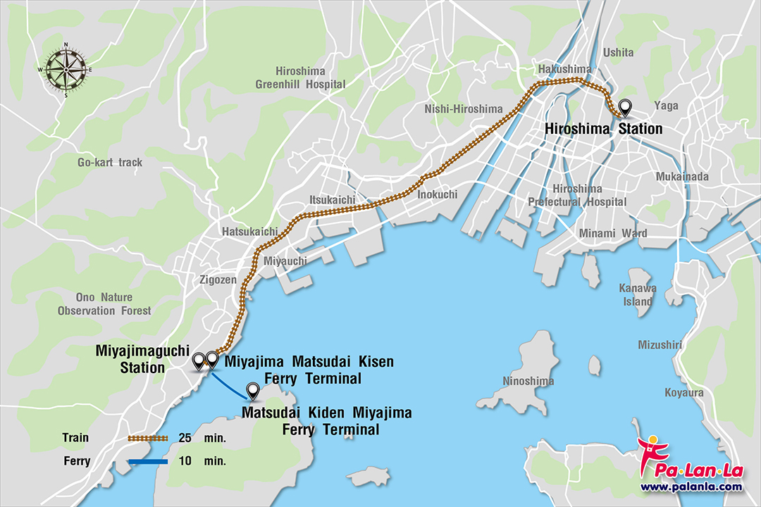 - รถไฟฟ้า นักท่องเที่ยวสามารถเดินทางโดยรถไฟจาก JR Hiroshima Station สาย Sanyo Line - JR Miyajimaguchi Station แล้วต่อเรือเฟอรี่มาลงที่เกาะมิยาจิม่า (Matsudai Kiden Miyajima Ferry Terminal) ซึ่งอยู่ห่างออกไปเพียงเล็กน้อย โดยเรือ JR Nishinihon Miyajima Ferry มีบริการเรือเฟอร์รี่ทุกประมาณ 15 นาที ใช้เวลาในการข้ามไปยังเกาะมิยาจิมะประมาณ 10 นาที
