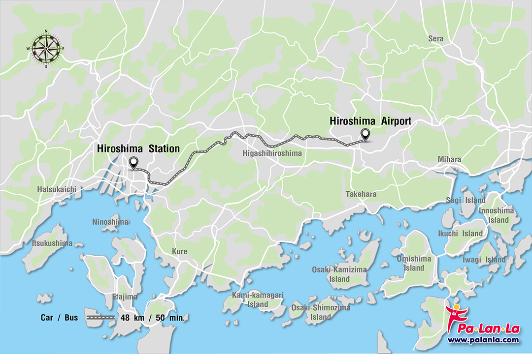 - รถลีมูซีนบัส เป็นการเดินทางจะสะดวกที่สุด โดยนักท่องเที่ยวเดินออกจากสนามบินประมาณ 200 เมตร เพื่อมานั่งรถจากสถานี Hiroshima Airport ใช้เวลาประมาณ 50 นาที ในการเข้าสู่ตัวเมืองฮิโรชิม่า ลงสถานี Hiroshima Station Shinkansen หรือ HIROSHIMA STATION ค่าโดยสารสำหรับตั๋วเที่ยวเดียวราคาประมาณ 1,300 เยน ส่วนตั๋วไปกลับ ราคาประมาณ 2,360 เยน โดยมีกำหนดใช้ภายใน 7 วัน