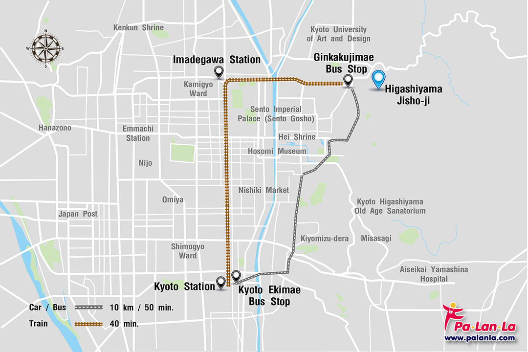 - รถไฟ จากสถานีเกียวโต (Kyoto Station) นั่งรถไฟสาย Kasasuma Line (สีเขียว) ลงที่สถานี Imadegawa Station เพื่อเปลี่ยนไปขึ้นรถประจำทางสาย 203 นั่งไปลงที่ป้ายรถประจำทาง Ginkakujimae Bus Stop แล้วเดินต่ออีกประมาณ 500 เมตร