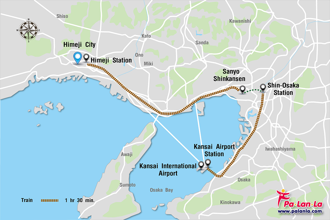 - รถไฟด่วน (Kansai International Airport Express Haruka) โดยสามารถเดินไปขึ้นได้ที่ Kansai Airport Station ซึ่งตัวสถานีจะเชื่อมต่อกับอาคารผู้โดยสารโดยตรง แล้วลงที่สถานี Shin-Osaka Station โดยจะใช้เวลาประมาณ 50 นาที ระยะทางโดยประมาณ 30 กิโลเมตร และเดินเล็กน้อยเพื่อเปลี่ยนสายไปขึ้น Sanyo Shinkansen เพื่อไปลงที่สถานี Himeji Station ใช้เวลาประมาณ 40 นาที ระยะทางประมาณ 90 กิโลเมตร ก็จะถึงเมืองฮิเมจิเรียบร้อย