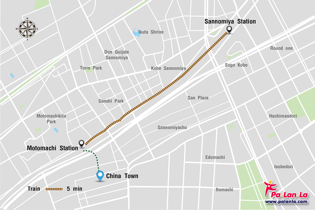- รถไฟ เมื่อถึงสถานี Sannomiya Station ให้เดินไปขึ้นรถไฟสาย Hankyu Kobe Line เพื่อไปลงที่สถานี Motomachi Station ระยะทาง 1กิโลเมตร ใช้เวลาประมาณ 5 นาที และเดินต่อไปประมาณ 150 เมตร ก็จะถึง China Town