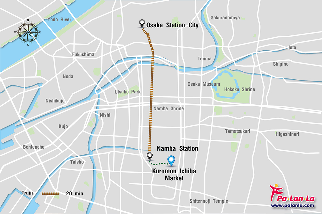 - รถไฟ จาก Osaka Station City ให้ขึ้นรถไฟสาย Midosuji Line ที่สถานี Umeda Station (M16) เพื่อไปลงที่สถานี Namba Station (M20) ระยะทางประมาณ 7 กิโลเมตร ใช้เวลาประมาณ 20 นาที แล้วเดินต่อไปอีก 500 เมตร ก็จะถึงตลาดคุโรมง