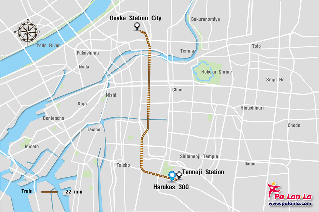 - รถไฟ จาก Osaka Station City ให้ขึ้นรถไฟสาย Midosuji Line ที่สถานี Umeda Station (M16) เพื่อไปลงที่สถานี Tennoji Station (M23) ระยะทางประมาณ 9 กิโลเมตร ใช้เวลาประมาณ 22 นาที แล้วเดินต่อไปอีกประมาณ 200 เมตร ก็จะถึงฮารุกัส
