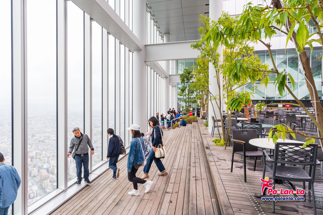 โดยที่นี่จะแบ่งออกเป็นสามโซนใหญ่ๆ ตามแต่ละชั้น เริ่มจากชั้น 58 จะจัดเป็น Sky Garden 300 ซึ่งเป็นพื้นที่ที่เราสามารถชมทิวทัศน์ของเมืองโอซาก้าได้แบบเต็มตา ทั้งยังมีร้านอาหาร รวมถึงลานชมวิวแบบเปิดโล่ง ให้คนที่ขึ้นไปได้สัมผัสความสวยงามของเมืองโอซาก้าจากมุมสูงได้อย่างเต็มที่ ท่ามกลางพื้นที่สีเขียวของต้นไม้ที่จัดวางเอาไว้ตามจุดต่างๆ ในชั้นอย่างสวยงาม