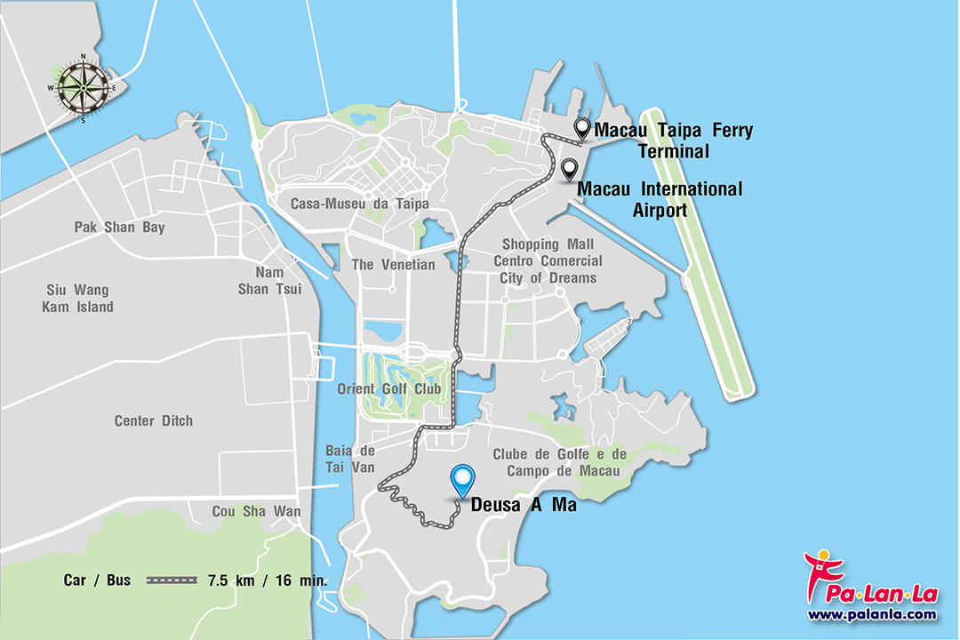 - รถยนต์ จาก Macau International Airport ระยะทางประมาณ 7.5 กิโลเมตร ใช้เวลาประมาณ 16 นาที หรือจากท่าเรือ Taipa Ferry Terminal ระยะทางประมาณ 8.2 กิโลเมตร ใช้เวลาประมาณ 17 นาที