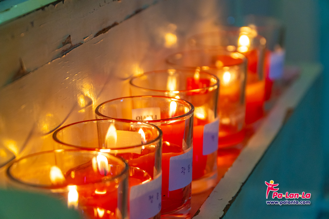 เทียนประดับที่จุดอยู่ตามรูปปั้นประติมากรรมภายในโบสถ์