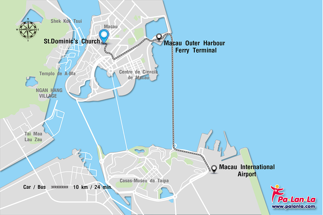 - รถยนต์ จาก Macau International Airport ไปยังโบสถ์เซนต์โดมินิกระยะทางประมาณ 10 กิโลเมตร ใช้เวลาประมาณ 24 นาที หรือจากท่าเรือ Macau Outer Harbour Ferry Terminal ระยะทางประมาณ 2.9 กิโลเมตร ใช้เวลาประมาณ 12 นาที