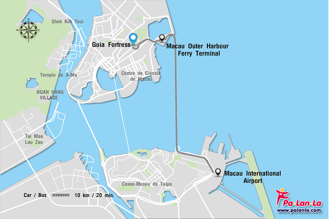 - รถยนต์ จาก Macau International Airport ไปยังป้อมปราการเกีย ระยะทางประมาณ 10 กิโลเมตร ใช้เวลาประมาณ 20 นาที หรือจากท่าเรือ Macau Outer Harbour Ferry Terminal ระยะทางประมาณ 2.2 กิโลเมตร ใช้เวลาประมาณ 5 นาที