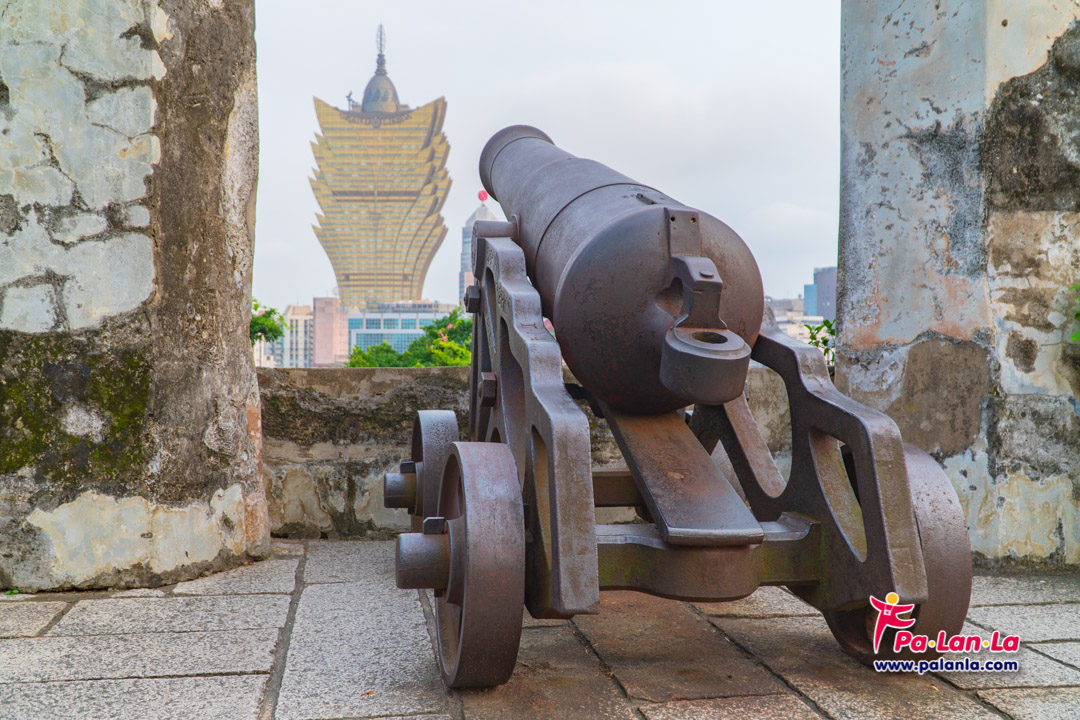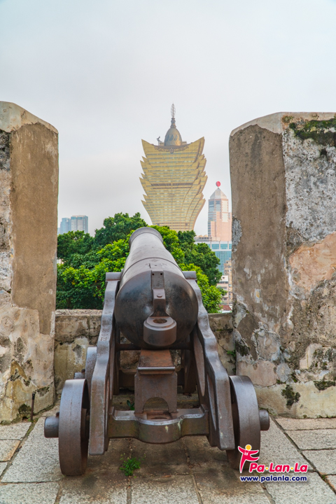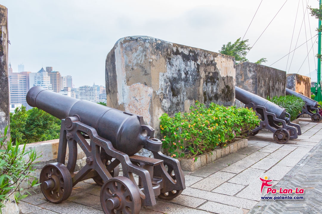 ปืนใหญ่ที่ด้านบนของป้อมปราการมองเตและวิวเมืองมาเก๊า