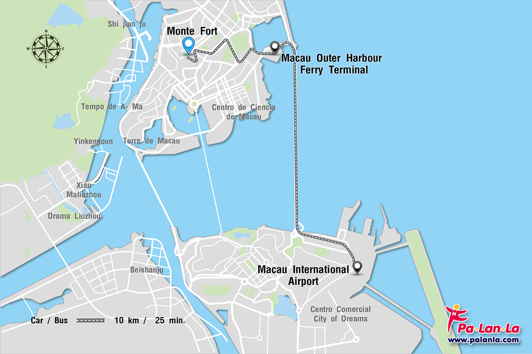 - รถยนต์/แท็กซี่ จากสนามบินมาเก๊าไปยังป้อมปราการมองเตระยะทางประมาณ 10 กิโลเมตร ใช้เวลาประมาณ 25 นาที หรือจากท่าเรือมาเก๊า ระยะทางประมาณ 2.6 กิโลเมตร ใช้เวลาประมาณ 10 นาที
