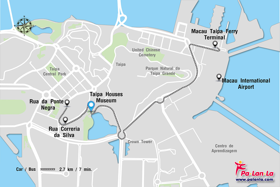 - รถยนต์ จาก Macau International Airport ไปยัง Taipa Houses Museum ระยะทางประมาณ 2.7 กิโลเมตร ใช้เวลาประมาณ 7 นาที หรือจากท่าเรือ Taipa Ferry Terminal ระยะทางประมาณ 3.4 กิโลเมตร ใช้เวลาประมาณ 11 นาที ถ้าเป็นรถแท็กซี่ให้แจ้งว่า ให้ลงที่สถานีรถแท็กซี่ Rua do Regedor Taxi Station