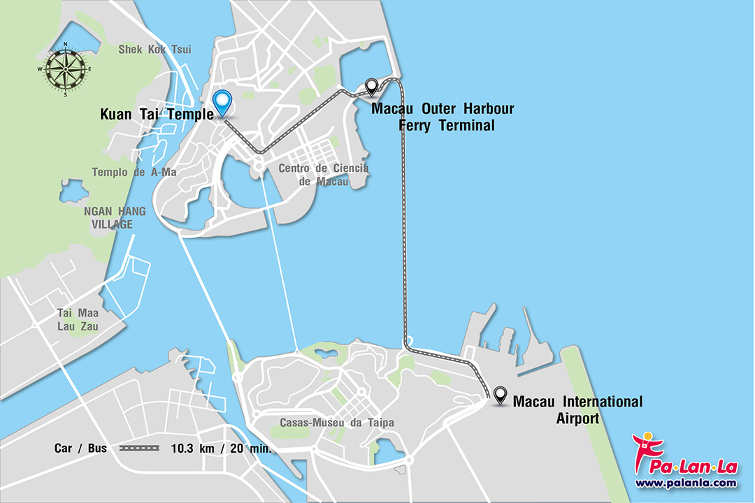 - รถยนต์/แท็กซี่ จากสนามบินมาเก๊าไปยังวัดกวนไทระยะทางประมาณ 10.3 กิโลเมตร ใช้เวลาประมาณ 20 นาที หรือจากท่าเรือมาเก๊า ระยะทางประมาณ 2.8 กิโลเมตร ใช้เวลาประมาณ 9 นาที