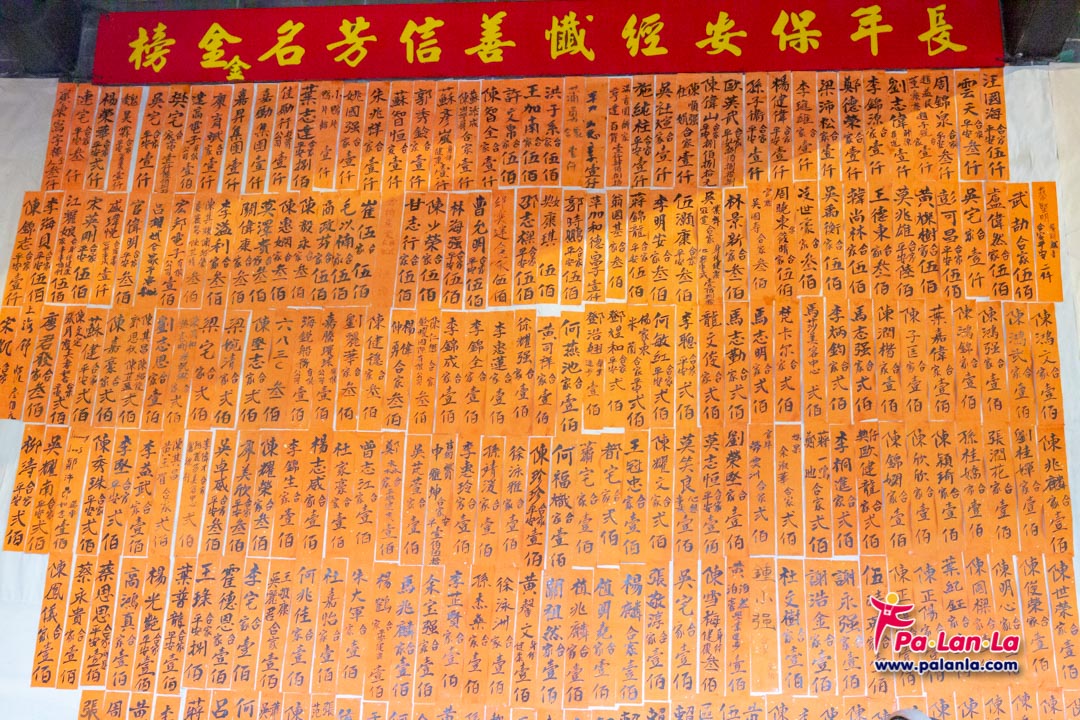 อักษรภาษาจีนที่ถูกแปะไว้ข้างกำแพง เอกลักษณ์หนึ่งของวัดกวนไท