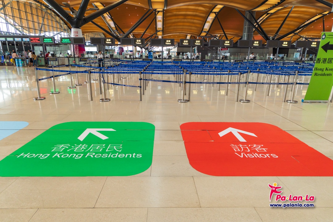 ผู้ที่เดินทางข้ามสะพานฮ่องกง-จูไห่-มาเก๊าจะต้องผ่านจุดตรวจคนเข้าเมืองขาออก (Departure) ในอาคารผู้โดยสารของ Hong Kong Port, Zhuhai Port หรือ Macao Port ที่ต้นทางก่อนข้ามสะพาน และผ่านจุดตรวจคนเข้าเมืองขาเข้า (Arrival) ในอาคารผู้โดยสารที่ Port ปลายทางอีกครั้งหลังจากข้ามสะพานมาแล้ว ทั้งนี้ เจ้าหน้าที่และขั้นตอนการตรวจคนเข้าเมืองของฮ่องกงนั้นค่อนข้างเข้มงวดกว่าที่มาเก๊า และนักท่องเที่ยวรวมถึงประชาชนทั่วไปที่เข้าแถวรอตรวจคนเข้าเมืองนั้นมีเป็นจำนวนมาก สิ่งแรกเลยที่ควรทำเมื่อเดินทางไปถึง Hong Kong Port คือ ให้เดินไปหยิบฟอร์มคนเข้าเมืองแผ่นเล็กๆ ตรงจุดที่มีป้ายสีส้มๆ เขียนว่า Departure Card (สำหรับขาออก) หรือ Arrival Card (สำหรับขาเข้า) มากรอก จากนั้นค่อยไปต่อแถวรอตรวจกับตม.หรือจะนำไปกรอกระว่างที่เข้าคิวแถวอยู่ก็ได้ เพราะหากลืมไม่ได้เดินไปหยิบแผ่นนี้มาก่อนที่จะไปเข้าแถวจะต้องเสียเวลาเดินออกจากแถวมาหยิบและเริ่มต่อคิวใหม่ ซึ่งการรีบออกจากแถวมาหยิบเอกสารแผ่นนี้ก็อาจทำให้โดนเจ้าหน้าที่เพ่งเล็งจนนำไปสู่การไม่ผ่าน ตม.ได้