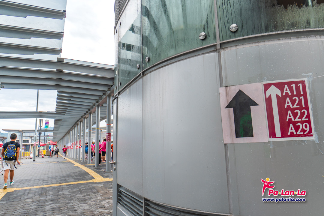 บริเวณทางเดินไปขึ้นรถบัสเข้าเมืองที่ Hong Kong Port และหมายเลขของรถสายต่างๆ กำกับไว้ชัดเจน