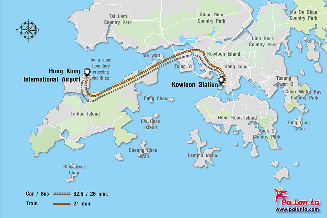 - รถยนต์ จากบริเวณสถานี Kowloon Station ระยะทางประมาณ 11.9 กิโลเมตร ใช้เวลาประมาณ 13 นาที