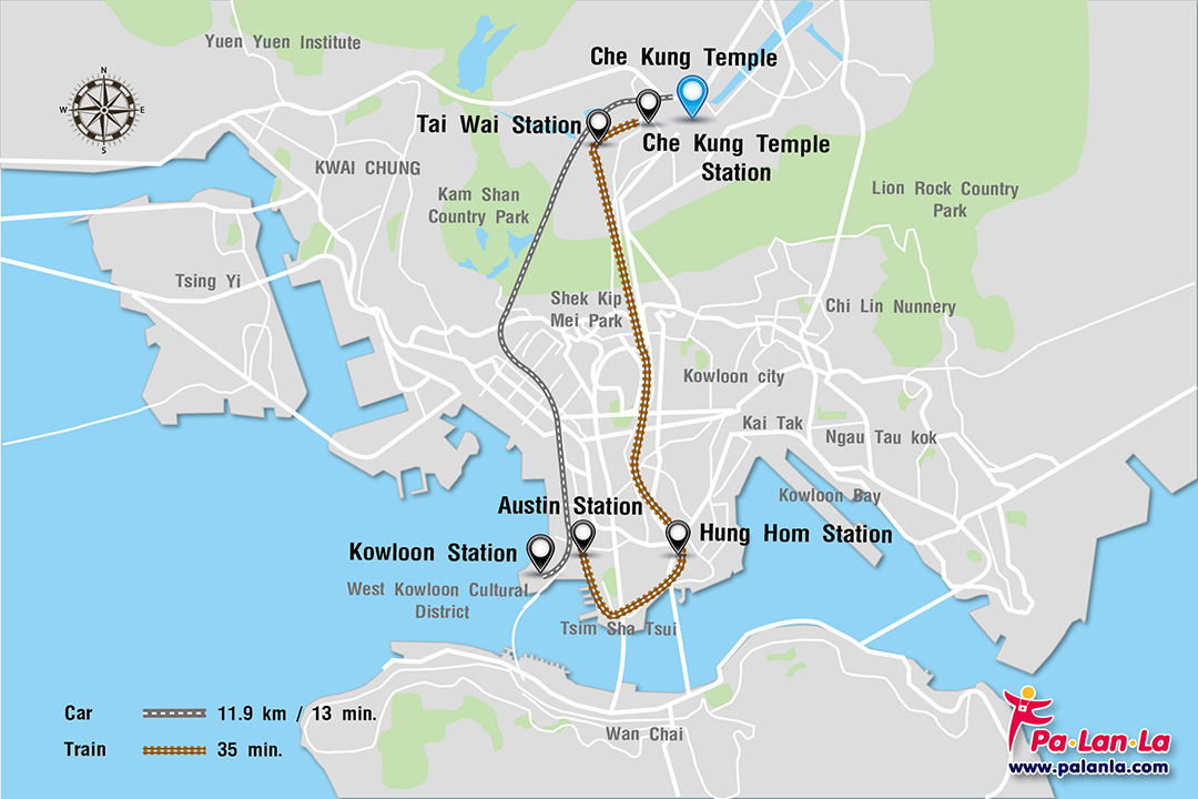 จาก Tai Wai Station ต่อรถไฟใต้ดินสายสีน้ำตาลไปลงที่สถานี Che Kung Temple Station