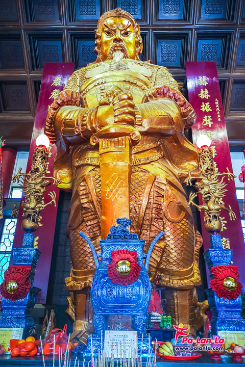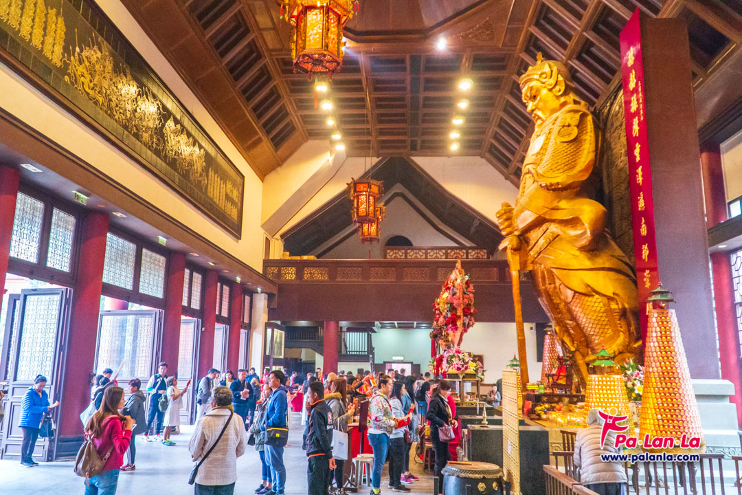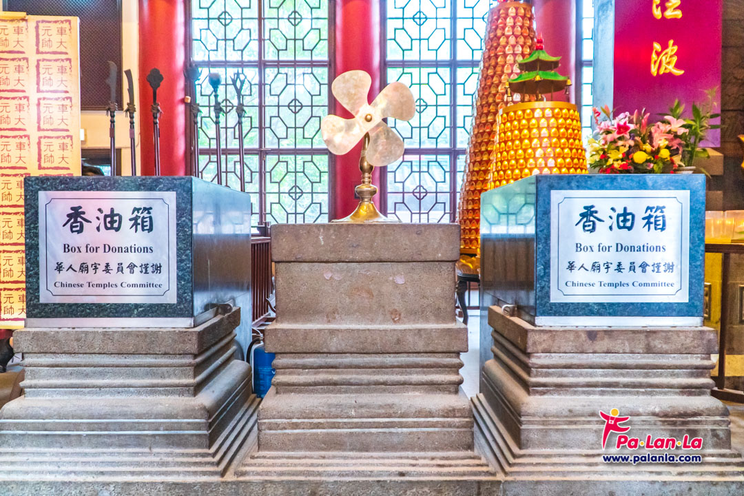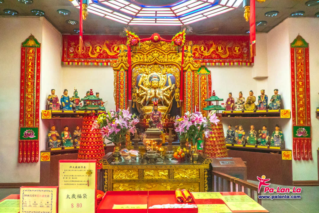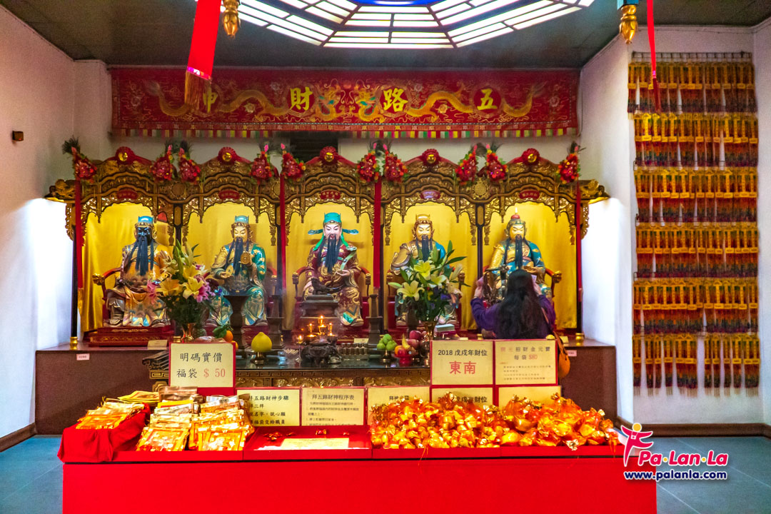 รูปปั้นของท่านแชกง (Che Kung) ซึ่งตั้งอยู่บริเวณห้องโถงหลัก เป็นจุดสำคัญที่นักท่องเที่ยวเดินทางมาสักการะเพื่อความเป็นสิริมงคล นอกจากนี้ ยังมีรูปปั้นเทพเจ้าองค์อื่นๆ กังหันแห่งโชคชะตา 4 ใบพัด กลองขนาดใหญ่และระฆังที่โดดเด่นตั้งอยู่ภายในวัด