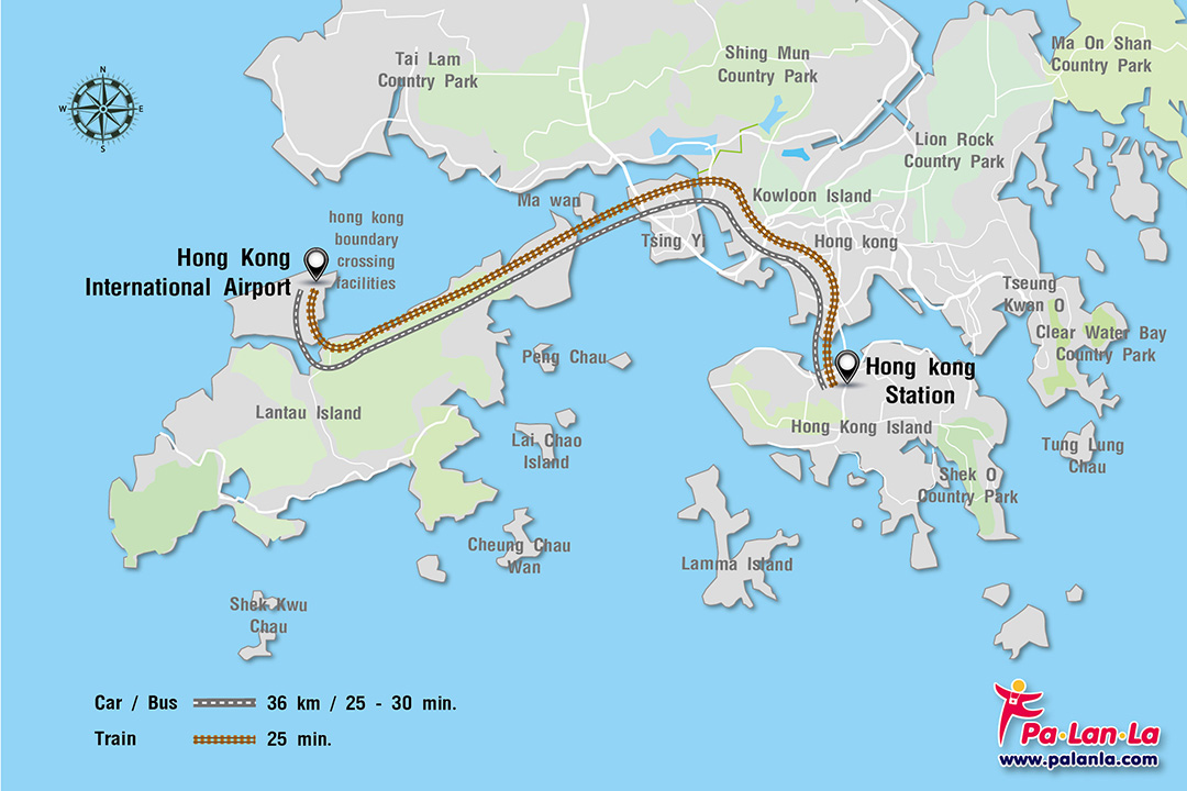 จากสนามบินนานาชาติฮ่องกง สามารถเดินทางมาที่สถานีรถไฟ Hong Kong Station ซึ่งเป็นสถานีเชื่อมต่อกับรถไฟใต้ดิน รถประจำทาง และรถ Shuttle Bus ดังนี้