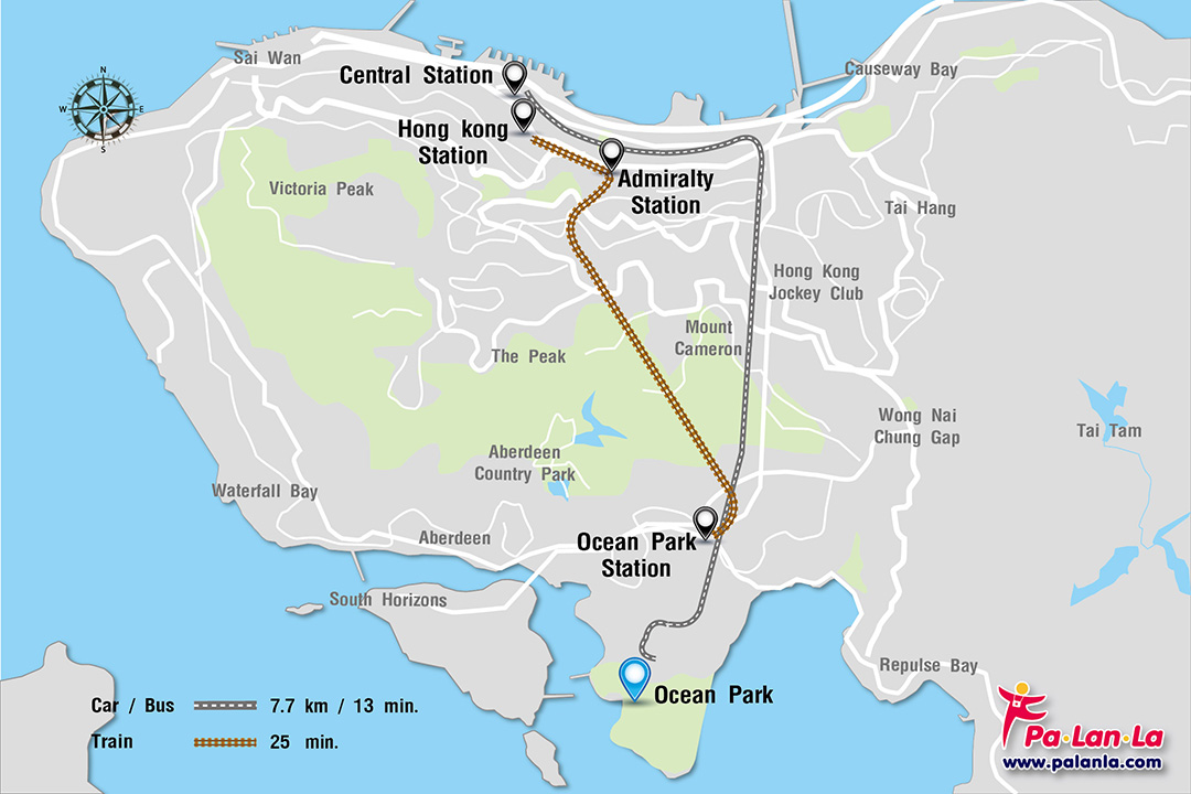 - รถไฟ จากสถานีรถไฟ Hong Kong Station เดินไปประมาณ 500 เมตร เพื่อขึ้นรถไฟใต้ดิน MTRสายสีแดง (Tsuen Wan Line) ที่ Central Station จากนั้น เปลี่ยนเป็น รถไฟใต้ดิน MTR สายสีเขียว (South Island Line) ที่สถานี Admiralty Station เพื่อไปลงที่สถานี Ocean Park Station รวมเวลาทั้งหมดประมาณ 25 นาที ดูรายละเอียดเพิ่มเติมได้ที่ http://www.mtr.com.hk/en/customer/main/index.html