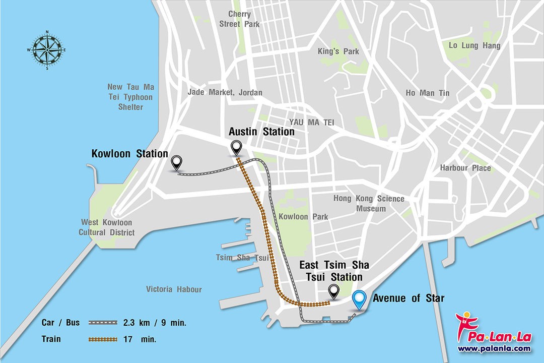 - รถยนต์ จากบริเวณสถานี Kowloon Station ไปยังถนนซุปเปอร์สตาร์ ระยะทางประมาณ 2.3 กิโลเมตร ใช้เวลาประมาณ 9 นาที