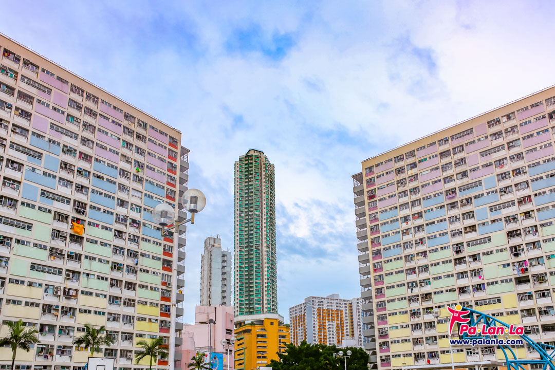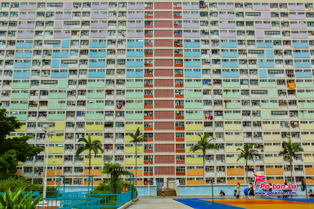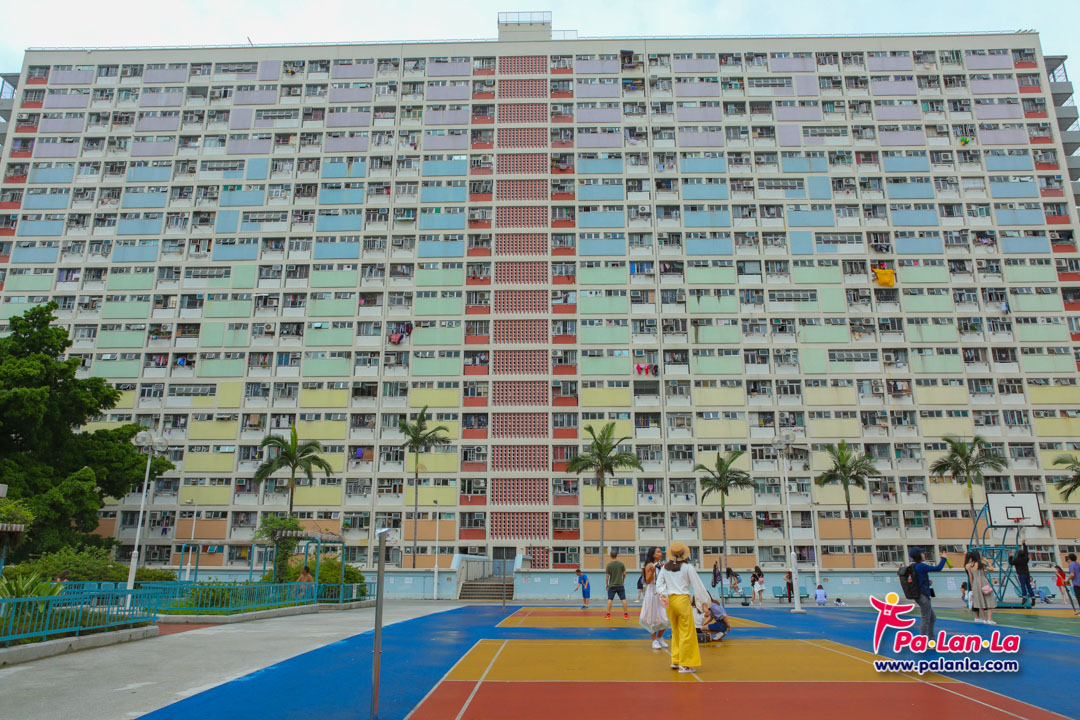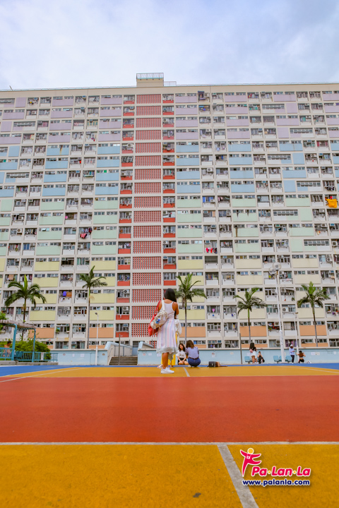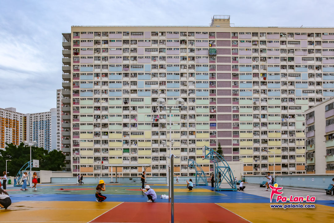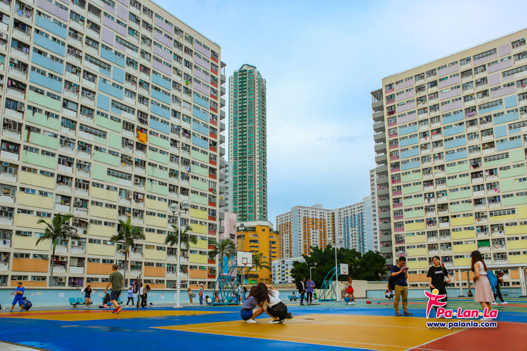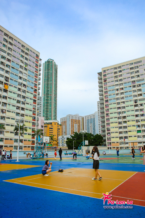 สนามบาสเก็ตบอลและอาคารสีสันสดใสด้านหลัง เอกลักษณ์ของชอยฮุงเอสเตท