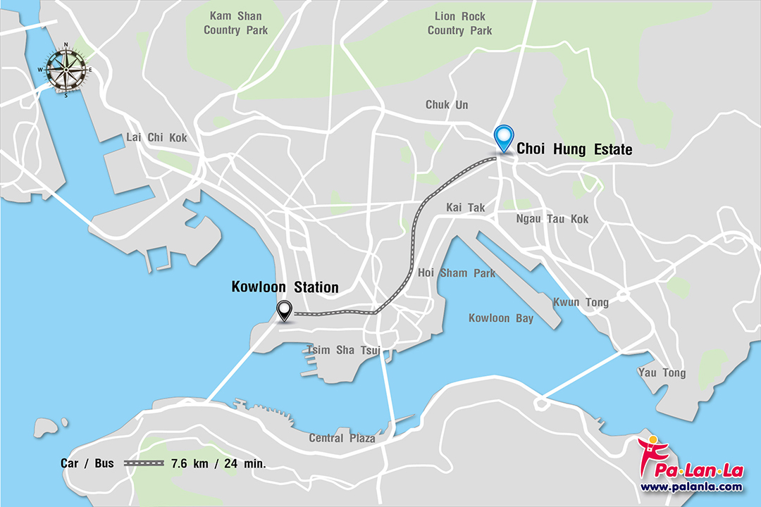- รถบัส จากสถานี Kowloon Station เดินประมาณ 7 นาที ไปที่ Austin Station ถนน Jordan เพื่อขึ้นรถบัสสาย 95 หรือ สาย A22 (Lam Tin Station) ไปลงป้าย Choi Hung Estate โดยใช้เวลาในการเดินทางประมาณ 24 นาที