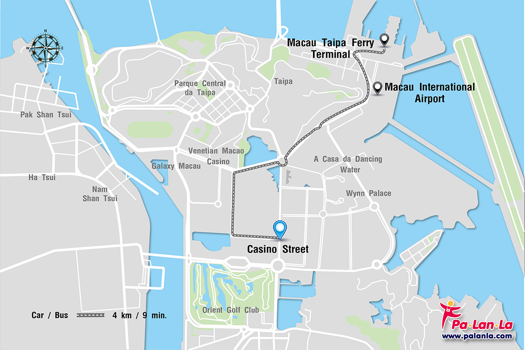 - รถยนต์ จาก Macau International Airport ระยะทางประมาณ 4 กิโลเมตร ใช้เวลาประมาณ 9 นาที หรือจากท่าเรือ Taipa Ferry Terminal ระยะทางประมาณ 4.8 กิโลเมตร ใช้เวลาประมาณ 10 นาทีจากนั้นจะเดินเที่ยวเล่นที่ถนนสายคาสิโนก็ได้ตามใจชอบเนื่องจากมีจุดให้แวะพักถ่ายรูป ช้อปปิ้งตลอดทั้งเส้นทาง