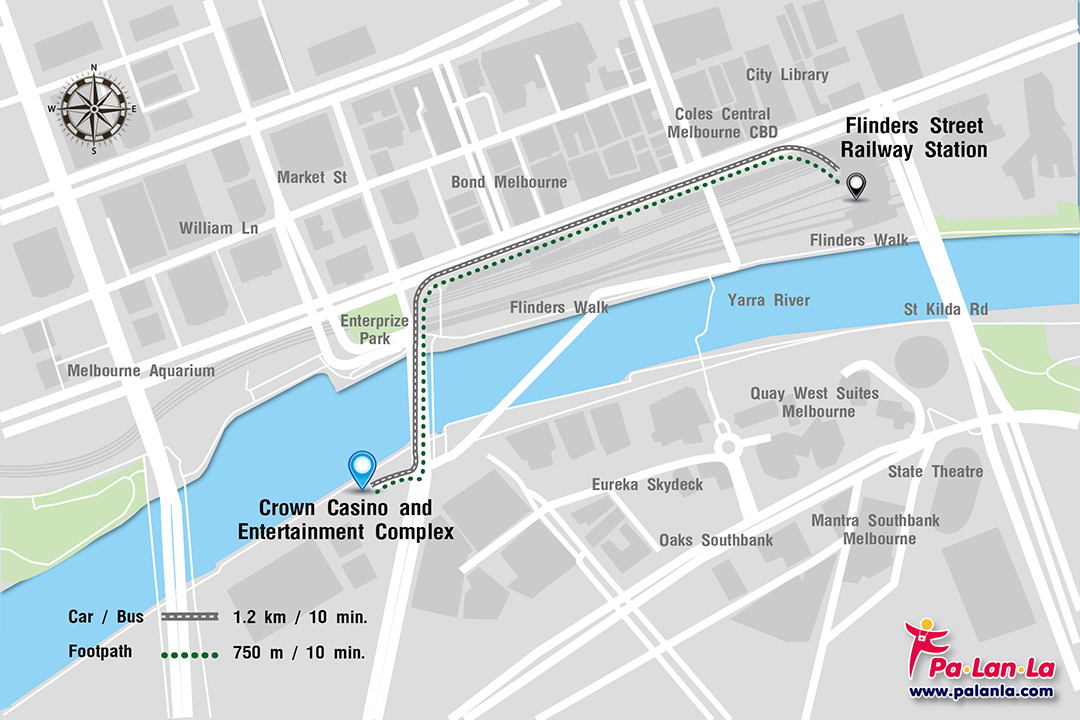 - การเดิน (Footpath) Crown Casino and Entertainment Complex อยู่ห่างจาก Finders Street Railway Station 750 เมตร ใช้เวลาในการเดินประมาณ 10 นาที ซึ่งเป็นวิธีที่สะดวกที่สุด