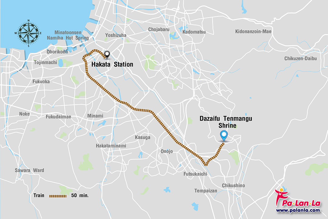 - รถไฟ จาก Hakata Station ให้ขึ้นรถไฟสาย Kuko Line ที่สถานี Hakata Station และไปเปลี่ยนสายที่สถานี Nishitetsu Fukuoka Station เพื่อไปลงที่สถานี Dazaifu Station ระยะทางประมาณ 20 กิโลเมตร ใช้เวลาเดินทางประมาณ 50 นาที ตัวสถานีจะอยู่บริเวณศาลเจ้าดาไซฟุเท็มมังกู