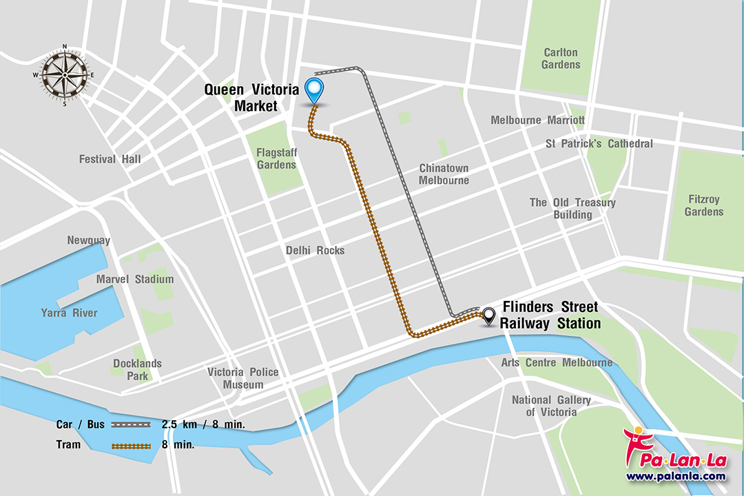 - รถราง (Tram) จากสถานี Flinders Street Station - Stop 1 นั่งรถรางสาย 59 หรือรถรางฟรีสาย 35 ไปลงที่ป้าย Queen Victoria Market ได้เลย ใช้เวลาในการเดินทางประมาณ 8 นาที