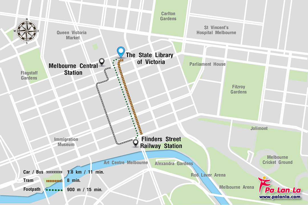 - เดิน (Footpath) การเดินจาก Flinders Street Station ไปยัง The State Library of Victoria โดยผ่านเส้น Swanston St มีระยะทาง 900 เมตร ใช้เวลาในการเดินประมาณ 15 นาที