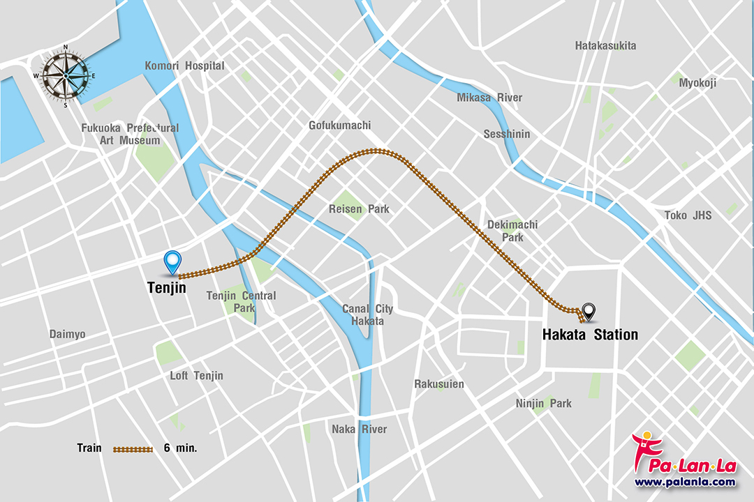 - รถไฟ จาก Hakata Station ให้ขึ้นรถไฟสาย Kuko Line ที่สถานี Hakata Station (K11) เพื่อไปลงที่สถานี Tenjin Station (K08) ระยะทางประมาณ 3 กิโลเมตร ใช้เวลาเดินทางประมาณ 6 นาที ก็จะถึงย่านเทนจิน