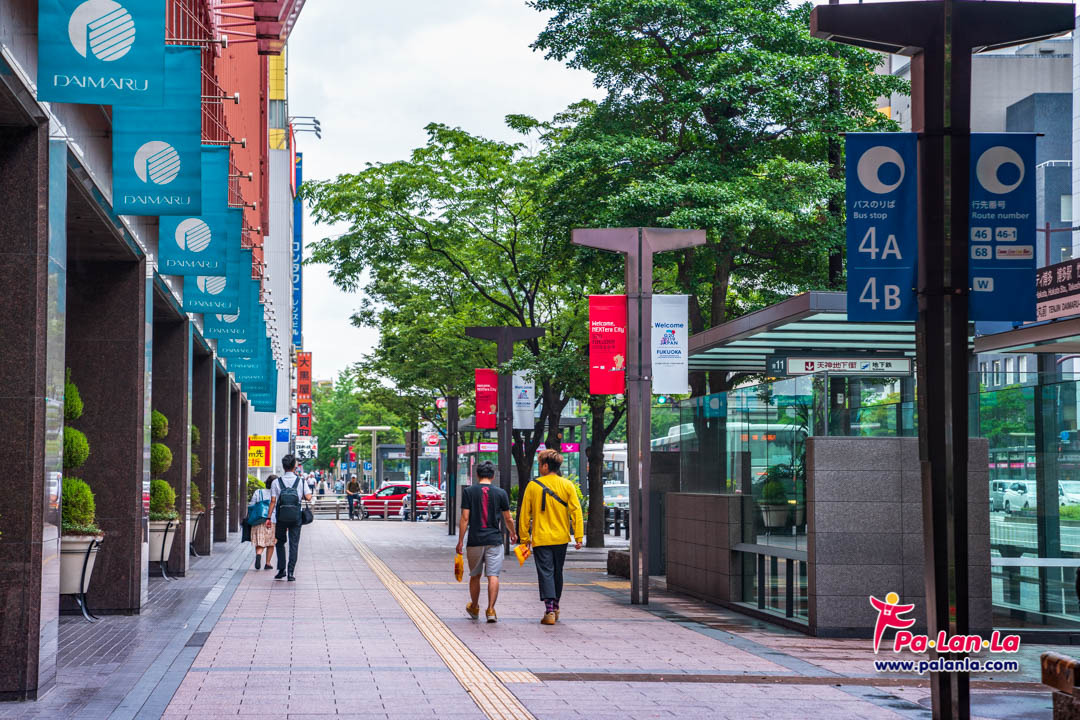 - รถบัส จากสนามบินให้เดินไปขึ้นรถบัสสาย นิชิเท็ตสึ (Nishitetsu Bus) ที่ป้ายรอรถบัสหมายเลข 2 ซึ่งจะอยู่ด้านหน้าอาคาร International Terminal ระยะทางประมาณ 5 กิโลเมตร ใช้เวลาเดินทางประมาณ 16 นาที ก็จะถึง Hakata Station