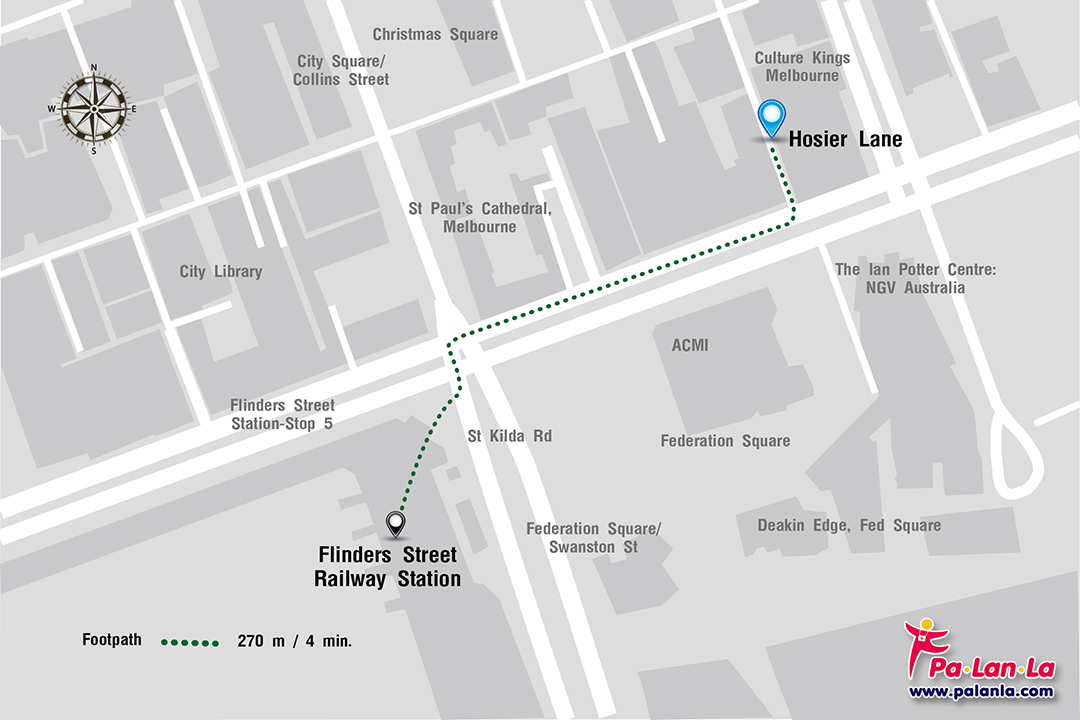 - เดิน (Footpath) จากสถานีรถไฟ Flinders Station ไป Hosier Lane วิธีที่สะดวกและใช้เวลาสั้นที่สุดคือการเดิน โดยใช้เวลาประมาณ 4 นาที ระยะทาง 270 เมตร ส่วนวิธีการเดินทางอื่นๆ ด้วยรถสาธารณะหรือรถยนต์จะมีเส้นทางที่อ้อมออกไปและใช้เวลานาน